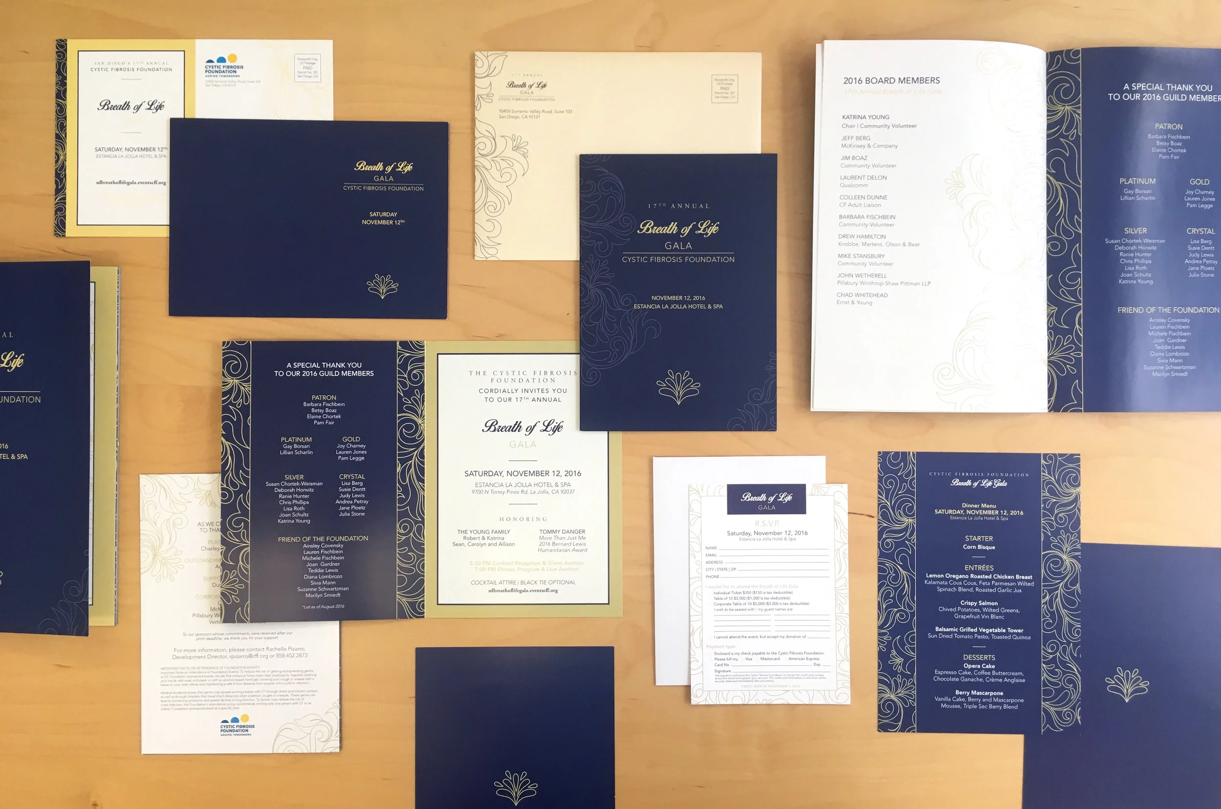 This year's elegant and inspiring stationary theme was influenced by the beautiful venue, Estancia La Jolla Hotel & Spa, and its lushes landscaping and water fountains. Paired with a refined and sophisticated version of the CF Foundation's exciting blue and yellow color palette, these invitations didn't disappoint. The classic and delicate details and rich colors truly add a touch of luxury to this already beautiful and insipiring gala.